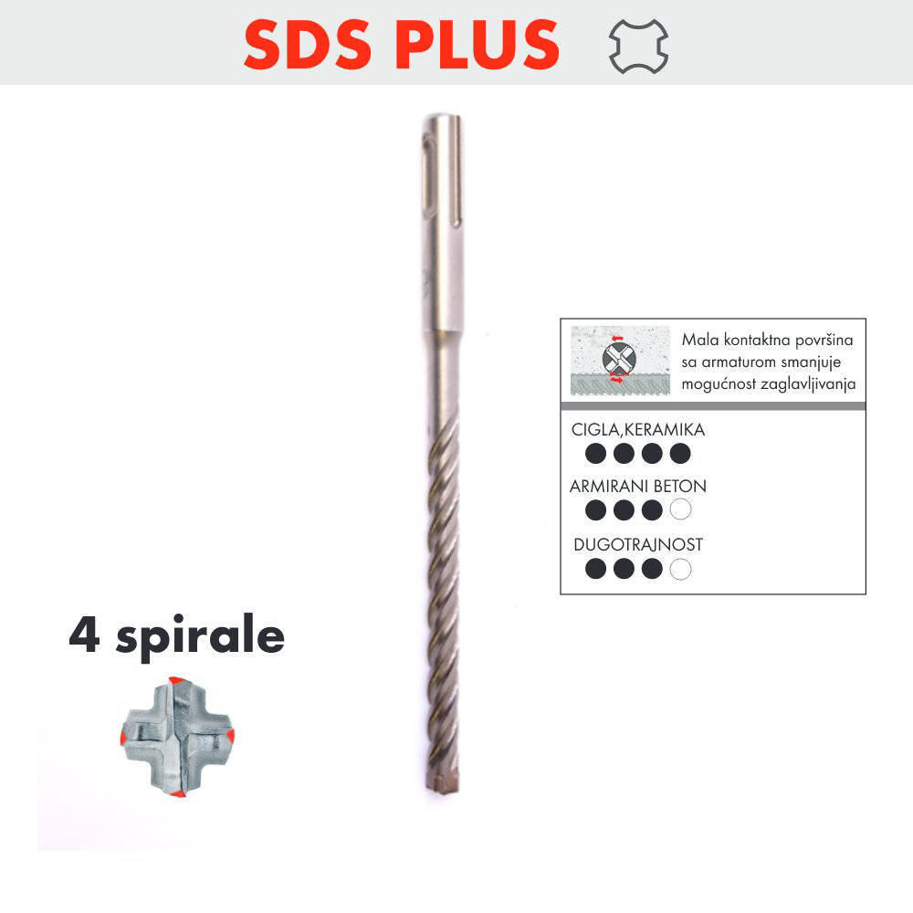 Plus Quad burgija ima usađene rezne pločice u žlijeb na vrhu burgije. Žlijeb ima oblik “+” i pločice su “uvarene” u njega . 4 rezne ivice od volfram-karbida, povećanih dimenzija za duži radni vijek i bolje performanse u armiranom betonu. Inovativni „ugao okreta.
