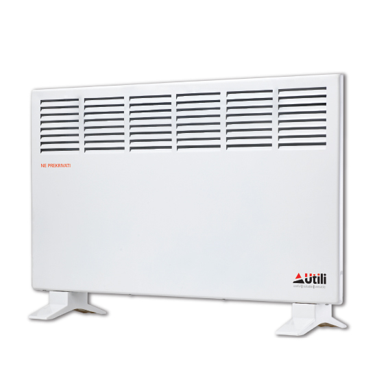UTILI Kompaktna konvektorska grijalica Designed je grijalica visoke toplotne efikasnosti i modernog dizajna. Ima termostat za podešavanje optimalne temperature, a snaga može da se podešava - 1000W ili 2000W. Termostat i podesiva snaga omogućavaju podešavanje i održavanje optimalne temperature u prostoriji. Koristi se kao samostojeća grijalica. Zbog zaštite IPX4- može da se koristi u kupatilu jer je zaštićena od prskanja vode iz svih pravaca. U sebi ne sadrži ventilator stoga je ne raznosi prašinu i radi bešumno. Težina je 4,73kg.