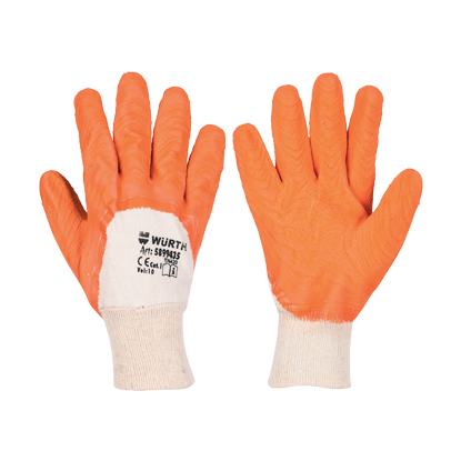 Duplo močene bešavne rukavice. Osnova izrađena od pamuka (žersej), prevlaka od naboranog lateksa koji pokriva dlan i prste. Otvorena nadlanica omogućava disanje kože.