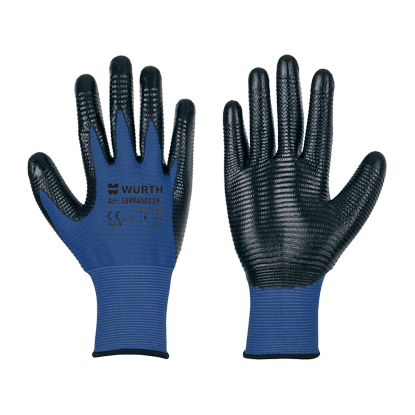 Pletena bešavna rukavica, izrađena od poliestera, presvučena glatkim nitrilom koji je zbog naborane strukture osnove i sam naboran, što dodatno povećava sigurnost hvata koju nitril sam po sebi pruža. Zahvaljujući nitrilu na dlanu ove rukavice su otporne na dejstva ulja, goriva, organskih rastvarača, blažih hemikalija.