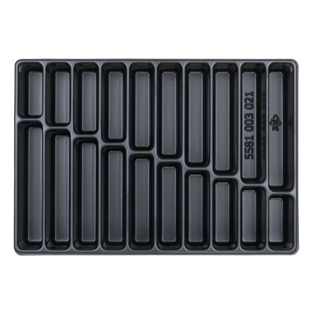 Plastični umetak za ORSY kofer 4.4.1 sistema omogućava čvrstu podijelu za uredno skladištenje i obezbjeđivanje različitih djelova. Sastoji se od 6 pregrada i ima dimenzije 335mm x 231,25mm x 54mm.