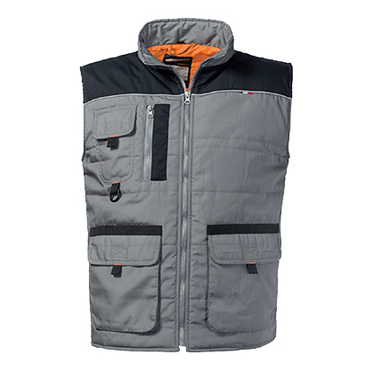 Postavljeni radni prsluk sa zakopčavanjem na rajsferšlusom i elastičnim dodatkom na rukavima za zaštitu od vjetra. Ima reflektujuće detalje, više funkcionalnih dzepova i držač za mobilni telefon sa preklop zatvaračem na čičak.