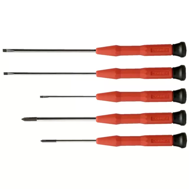 Set preciznih odvijača (5 kom.), odvijači su napravljeni od hrom-vanadijum čelika, poseduju ergonomsku dršku koja sprečava klizanje i pruža dobar hvat.